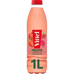 Ingrédients : Eau minérale naturelle Vittel (86%), jus de fruits à base de concentrés 8% (fraise 4%, framboise 4%), sucre liquide, arôme naturel de fraise, arôme naturel de framboise avec autres arômes naturels, arôme naturel, acidifiant : acide citrique, concentrés (carotte, citron).