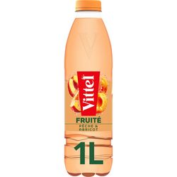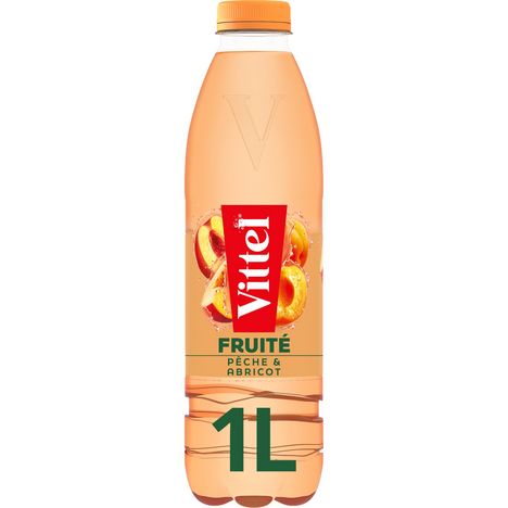 Ingrédients : Eau minérale naturelle Vittel® (84,4%), jus de fruits à base de concentrés 10% (pêche 5%, abricot 5%), sucre liquide, arôme naturel de pêche, arôme naturel d'abricot avec autres arômes naturels, arôme naturel, acidifiant : acide citrique, concentrés (citron, carthame, carotte).