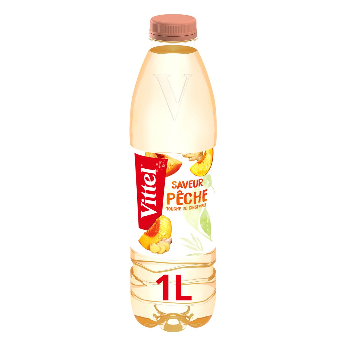 Boisson à l'eau minérale naturelle VITTEL aromatisée à la pêche et au gingembre.
