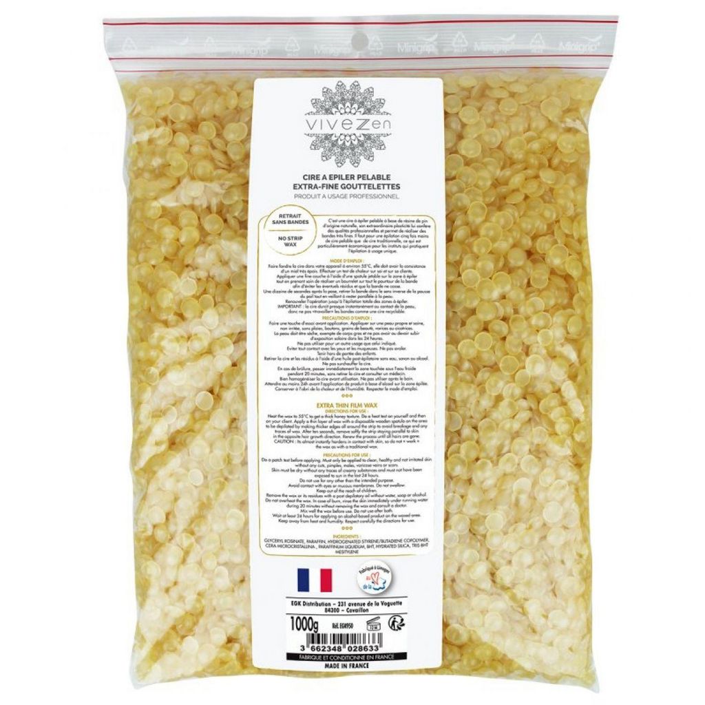 La cire à épiler Vivezen « Extra-fine », est une cire à base de résine naturelle de pin. Son estérification lui confère une extraordinaire souplesse et plasticité. Elle permet de réaliser des bandes très fines. Les cires pelables Vivezen sont des cires qui se retirent sans bandes, elles sont conseillées pour les épilations des peaux délicates et des zones sensibles comme le maillot, le visage et les aisselles. Cette cire n'est pas recyclable, et convient à tous les types de peaux. Sa fabrication est 100% Française, elle est conditionnée en sachet de 1 kg. Cette cire s'utilise avec un chauffe cire ou un chauffe pot, et est à base de résine naturelle de pin.