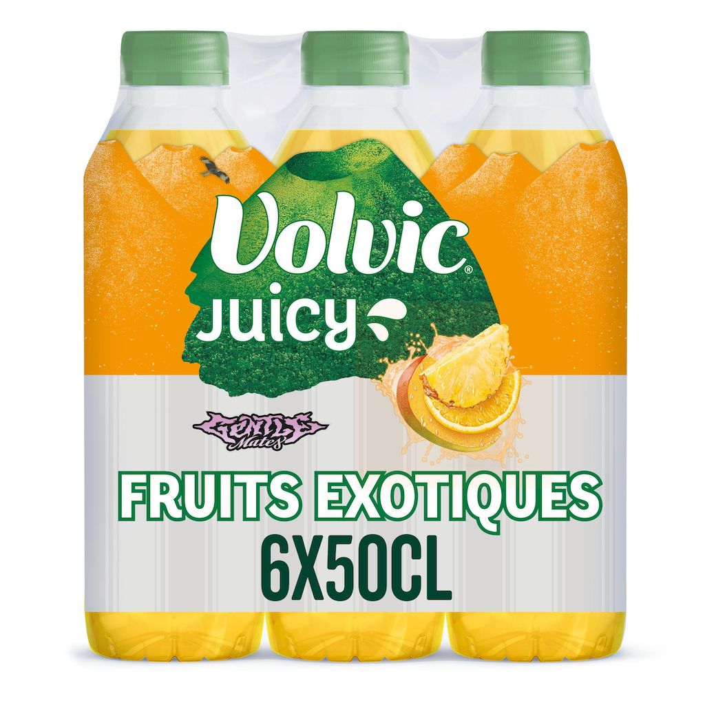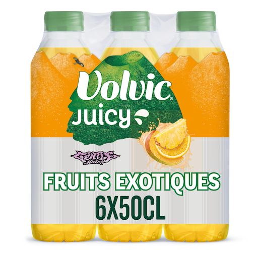 Volvic Juicy Fruits Exotiques, c'est tout le plaisir du bon jus de fruits exotiques* associé à l'eau minérale naturelle Volvic. Volvic Juicy Fruits Exotiques est sans conservateurs, le tout dans une bouteille 100% en matière recyclée** et toujours recyclable ! Profitez de Volvic Juicy Exotique 50cL, à boire très frais ! *Boisson aromatisée à l'eau minérale naturelle Volvic, au jus de fruits à base de concentré. **Bouchon et étiquette exclus, mais nous y travaillons !
