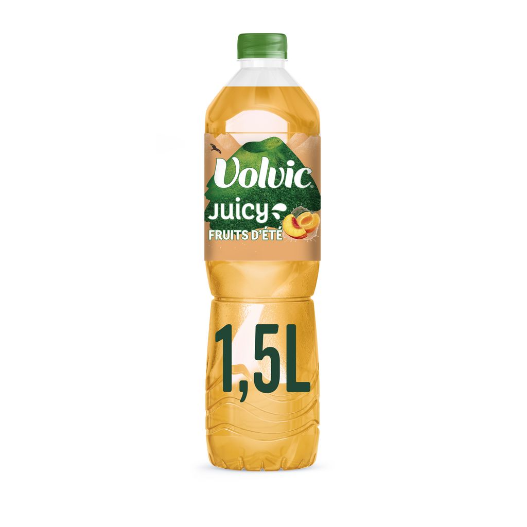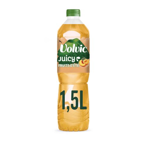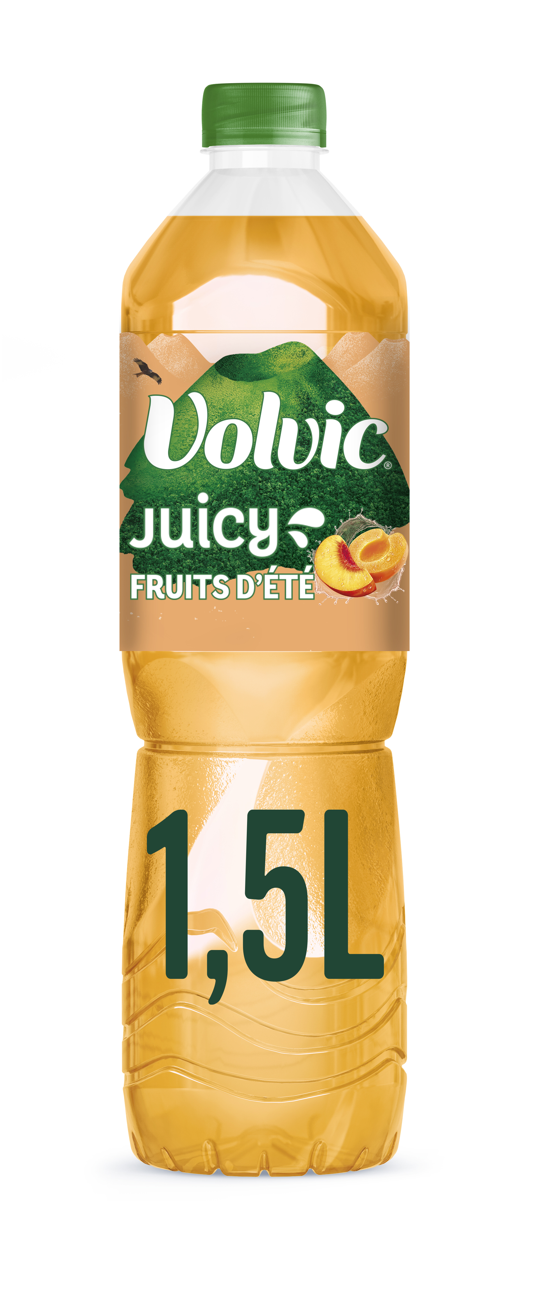 Volvic Juicy Fruits d'Été, c'est tout le plaisir du bon jus de fruits d'été* associé à l'eau minérale naturelle Volvic. Volvic Juicy Fruits d'Été est sans aucun additif, le tout dans une bouteille 100% en matière recyclée** et toujours recyclable !!! Profitez de Volvic Juicy Fruits d'été 1,5L, à boire très frais ! *Boisson aromatisée à l'eau minérale naturelle Volvic, au jus de fruits à base de concentré. **Bouchon et étiquette exclus, mais nous y travaillons !