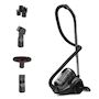 - Accessoires : tube télescopique métal, brosse sol, embout 2 en 1, brosse canapé, système de rangement