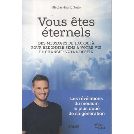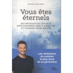 Le témoignage inédit d'un médium communiquant avec les défunts qui bouleverse notre manière d'appréhender la vie, et donne envie d'aimer, de vibrer, de vivre les expériences qui nous sont offertes ici-bas. Un livre-déclic qui inaugure le nouveau label dédié à la spiritualité, En quête de sens , porté par un des médiums les plus en vue de sa génération. UN TEMOIGNAGE INEDIT : Le témoignage inédit de Nicolas-David Paris, médium communiquant avec les défunts qui bouleverse notre manière d'appréhender la vie. Un livre spirituel déclic qui inaugure le nouveau label Solar dédié à la spiritualité, En quête de sens , porté par un des médiums les plus en vue de sa génération. Sans pouvoir l'expliquer, en se connectant aux messagers de l'invisible (anges, défunts, guides...), Nicolas-David Paris perçoit et canalise des messages que les défunts transmettent à leurs interlocuteurs. Le point commun de ces messages ? Ils sont tous porteurs d'amour, ils nous disent que la vie est une école pour vivre des expériences, ressentir des émotions, échouer, se relever, rebondir, avancer, explorer, célébrer, rire, souffrir, vibrer, aimer... et s'aimer surtout. UNE AUTRE MANIERE DE VOIR LA VIE ET LA MORT : Et si nos chers disparus continuaient à nous aimer et à veiller sur nous depuis l'au-delà ? Et s'ils pouvaient communiquer avec nous ? Et si, soucieux de nous, ils cherchaient à nous guider dans notre vie ? Ponctué de nombreux cas de consultation et de communication avec l'au-delà, ce livre spirituel ouvre une autre voie pour avancer sereinement sur notre chemin de vie. Vous ne verrez plus la mort ni la vie comme avant, car, oui, vous êtes éternels ! UN DES MEDIUMS LES PLUS EN VUE DE SA GENERATION : Nicolas-David Paris est médium depuis l'enfance. A 40 ans, il quitte son métier de steward pour se consacrer entièrement à sa mission de vie : délivrer les messages des anges et de l'au-delà. Nicolas-David est suivi par plus de 250 000 personnes sur les réseaux sociaux, où il anime tous les mois un live. Le jeune médium en vue de la place parisienne a été nommé révélation de l'année 2020 des meilleurs médiums de France par le Guide la Voyance. Il a été déclaré en 2022 meilleur médium à Paris par le site réputé Spiritualité. com. Vous êtes éternels ! : Livre de spiritualité de Nicolas-David Paris, médium.