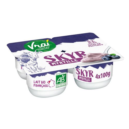 Skyr bio myrtille VRAI : une recette gourmande et qualitative. Elle allie la douceur du lait de vache bio (collecté en Bretagne et Normandie à moins de 100km de nos ateliers de production) avec l'intensité et la fraîcheur de la myrtille.