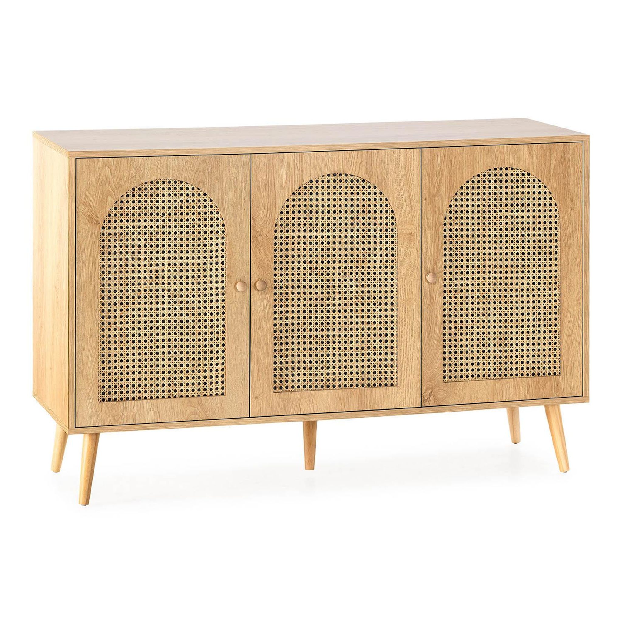 ·, Le buffet Luna est un meuble 3 portes en mélamine et rotin naturel. Compact et robuste, il s'intègre parfaitement au style nordique. Ses lignes droites et épurées lui confèrent une allure minimaliste, fidèle aux dernières tendances en matière de décoration intérieure.