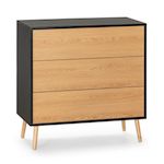 ·, Cette commode allie la finition du bois de chêne et du noir, un contraste qui servira de fil conducteur à l'esthétique générale de l'ensemble de la pièce. La structure principale du meuble est noire, tandis que les parties avant et les pieds sont de couleur bois. L'ouverture des tiroirs s'effectue grâce à un système de poussoir, un mécanisme qui permet d'ouvrir les tiroirs au moyen d'une subtile poussée que vous activez vous-même intuitivement. Ainsi, sans poignées, la commode gagne en élégance et en sophistication.