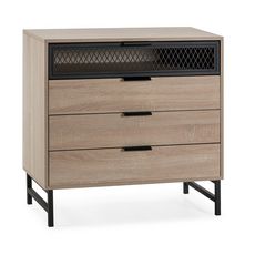 ·, Le corps du meuble est de couleur chêne clair, un ton qui contraste avec le noir des poignées, des pieds et de la partie de la grille métallique.