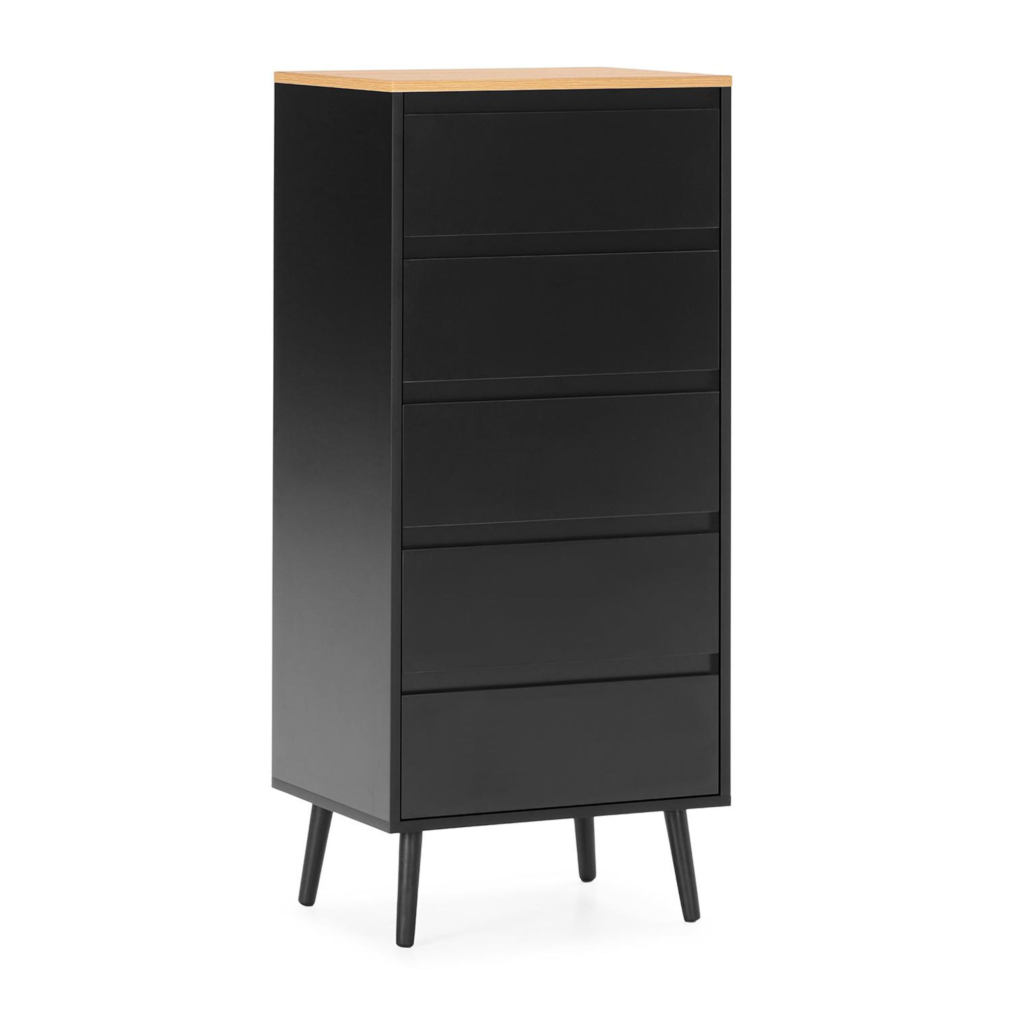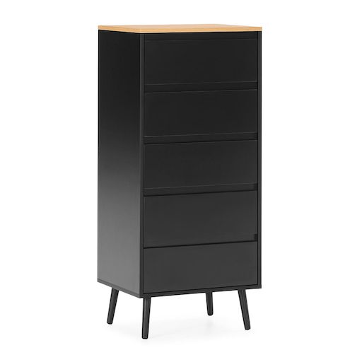 ·, La commode haute Desi est composée de 5 tiroirs, idéale pour organiser tous les vêtements et accessoires qui n'ont pas leur place dans le placard, la commode ou les tables de chevet. Elle peut même remplacer parfaitement une commode, puisqu&rsquo,il s&rsquo,agit d&rsquo,un meuble haut et étroit. C'est une pièce au design élégant et aux lignes droites qui peut améliorer instantanément l'atmosphère décorative de n'importe quelle maison. Il est temps de changer de meuble !