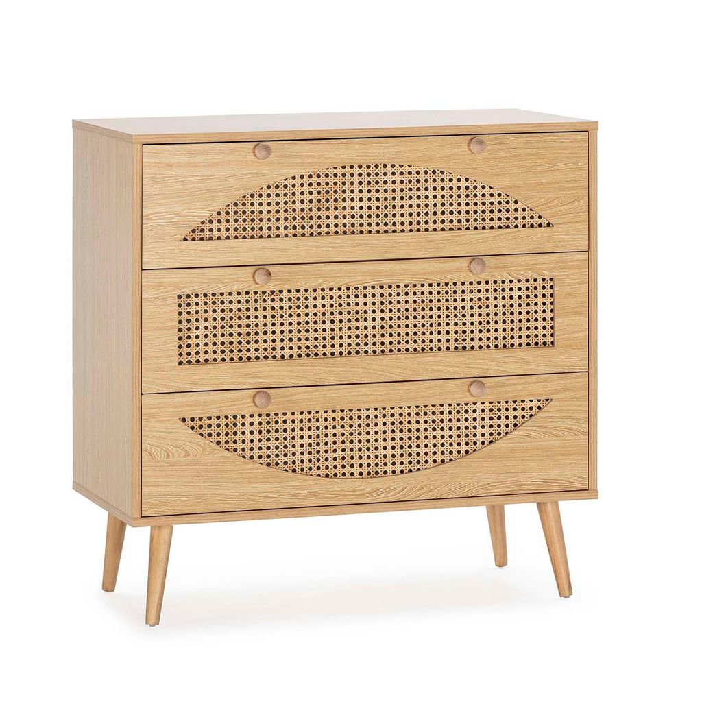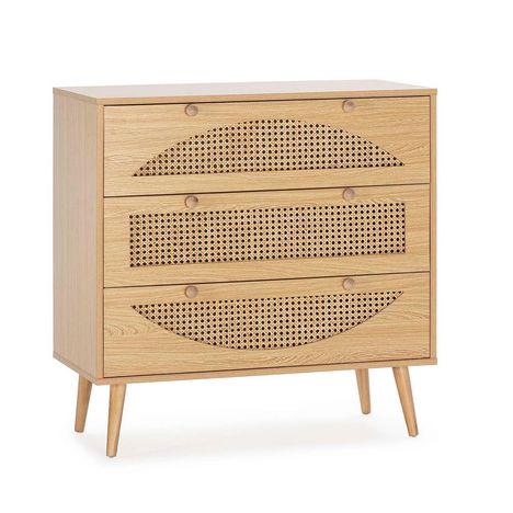 ·, Son aspect esthétique se distingue par les demi-lunes dessinées et le dessin en grille sur les façades des tiroirs. Concrètement, cette partie du meuble (la partie tressée des grilles miniatures) est réalisée en rotin naturel, une matière fibreuse végétale qui a révolutionné le secteur du meuble et de la décoration intérieure.