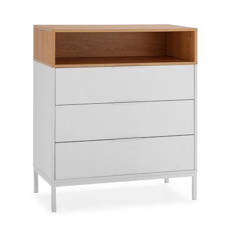 ·, Une grande partie de sa structure est blanche, à l'exception du trou et du dessus de la commode qui est en chêne. Ces détails ajoutent du charme au mobilier dans son ensemble, puisqu'il a été spécialement conçu pour offrir à parts égales élégance et modernité.