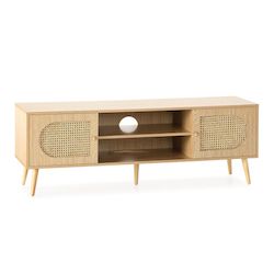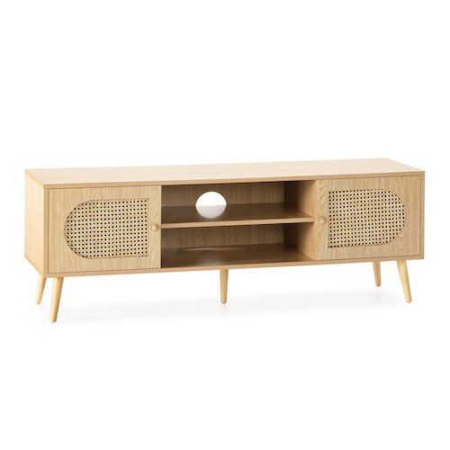 ·, Ce meuble TV est fabriqué en mélamine couleur chêne de haute qualité sur la majeure partie de sa structure. Les demi-lunes en fibres végétales tressées sur les portes, en rotin naturel, sont également remarquables. Le rotin est un matériau naturel qui apporte une touche de chaleur et de sophistication à la décoration. Il s'harmonisera parfaitement avec d'autres éléments en matériaux naturels, tels que des paniers en jacinthe d'eau, des tapis en jute ou en coton, etc.