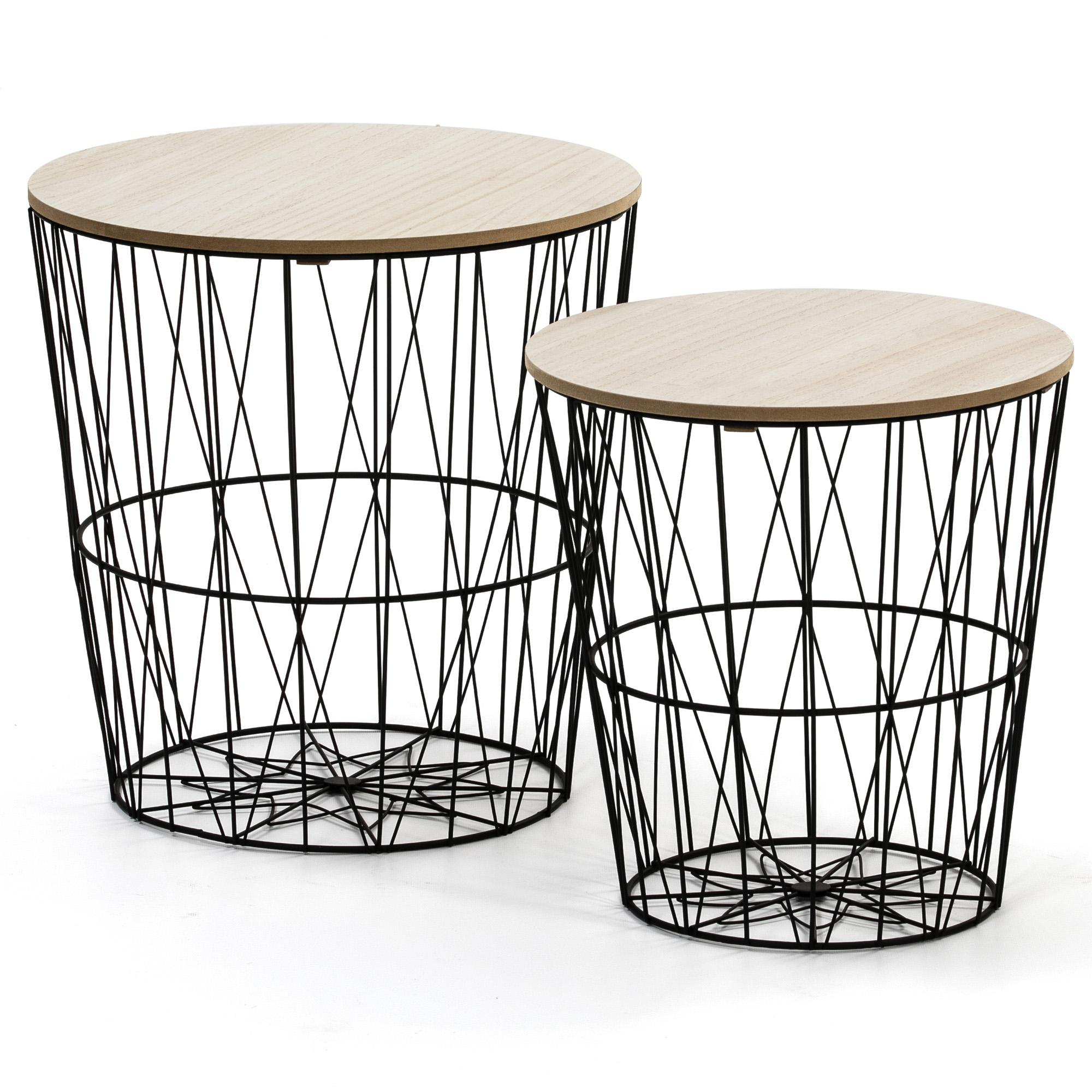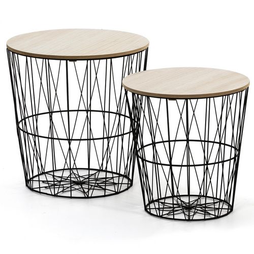 - Tables basses : les tables basses ont des plateaux en bois amovibles qui renferment des paniers en métal, très pratiques comme espace de rangement.