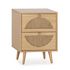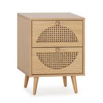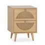 ·, Son aspect esthétique se distingue par la demi-lune tracée et le dessin en grille sur la façade des deux tiroirs. Concrètement, cette partie du meuble (la partie tressée des grilles miniatures) est réalisée en rotin naturel, une matière fibreuse végétale qui a révolutionné le secteur du meuble et de la décoration intérieure.