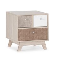 ·, La table de nuit Maia contient 3 tiroirs et est également tricolore. Avec la fonctionnalité qu'elle présente et sa touche de modernité, cette table apportera à votre chambre un charme nordique idéal pour cet espace de repos.