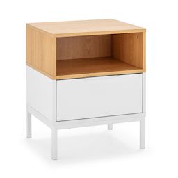 ·, La table de nuit Nieve est un meuble en blanc et chêne qui mettra en valeur un style décoratif nordique dans la pièce. Un meuble qui se distingue par sa présence et ses lignes droites, un style simple et minimaliste qui transformera la décoration de votre pièce en lui apportant un air de luminosité, de fraÎcheur et de confort. Cette table se compose d'un tiroir et d'un espace dans lequel vous pourrez ranger des objets de décoration.