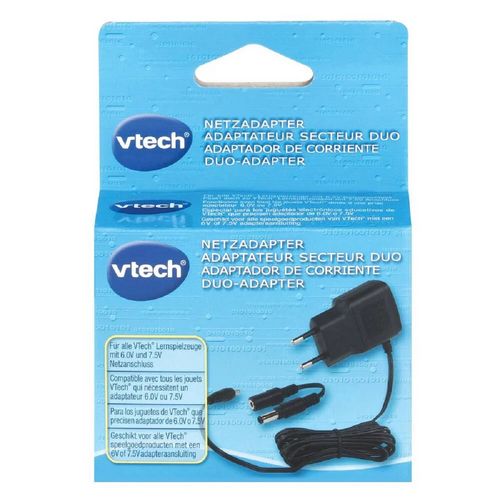 Adaptateur secteur/transformateur VTech DuoAdaptateur/transformateur universel 6V.Sortie 3.5mm – L'adaptateur/transformateur altique est compatible avec les produits suivants : - Consoles Storio MAX, - KidiCom Max,- Kidi LightShow Party- Kidi SuperStar LightShow- Ainsi que tous les produits mis sur le marché à partir de 2018.Sortie 5.5mm - L'adaptateur/transformateur est fourni avec un câble de conversion permettant de brancher les produits moins récents :- Consoles MobiGo- Consoles Storio (hors Storio MAX)- KidiMagic- Kidi SuperStarTous les ordinateurs VTech dotés d'une prise adaptateur.