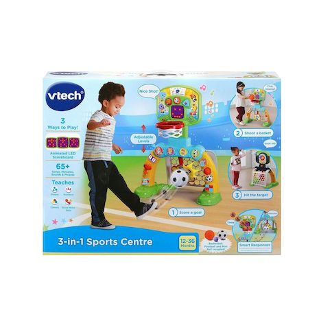 Le Centre de Sport 3-en-1 VTech est un jouet interactif conçu pour les enfants à partir de 12 mois, favorisant le développement des compétences motrices. Ce jouet multifonction permet aux tout-petits de tirer un panier, marquer un but ou frapper une cible grâce à un tableau de score animé. Équipé de