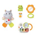 Le coffret naissance "éveil des sens " est le coffret idéal pour accompagner les premiers pas de votre enfant dans le développement de son éveil. Ce coffret comporte plusieurs éléments pour émerveiller bébé : - Un hippo en peluche tout doux avec différentes textures et des pattes en plastique souple pour apaiser les poussées dentaires ; - Un hochet grenouille qui développe le toucher et stimule la motricité ; - Un miroir en forme de fleur pour encourager la découverte de soi ; - Un piano avec avec sons et lumières pour stimuler la motricité et l’ouïe en douceur. Grâce au packaging très travaillé, le coffret éveil des sens est le cadeau de naissance idéal à offrir !