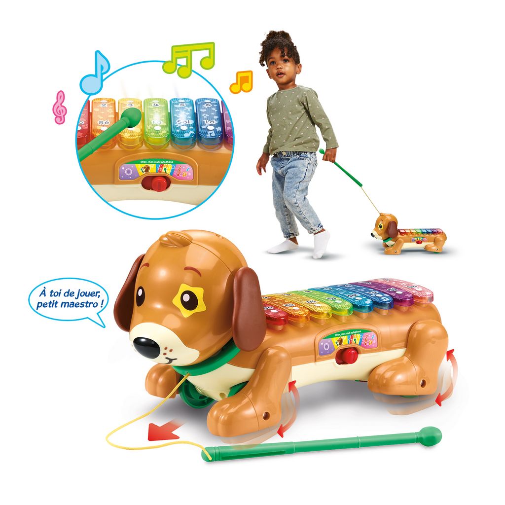 En plus de jouer librement, ils peuvent suivre des séquences musicales guidées par des lumières pour apprendre à reconnaître les patterns sonores. Elton offre également une expérience unique de balade, grâce à un maillet transformable en laisse, permettant aux petits de le tirer tout en écoutant des comptines. Developpant ainsi langage et coordination motrice.