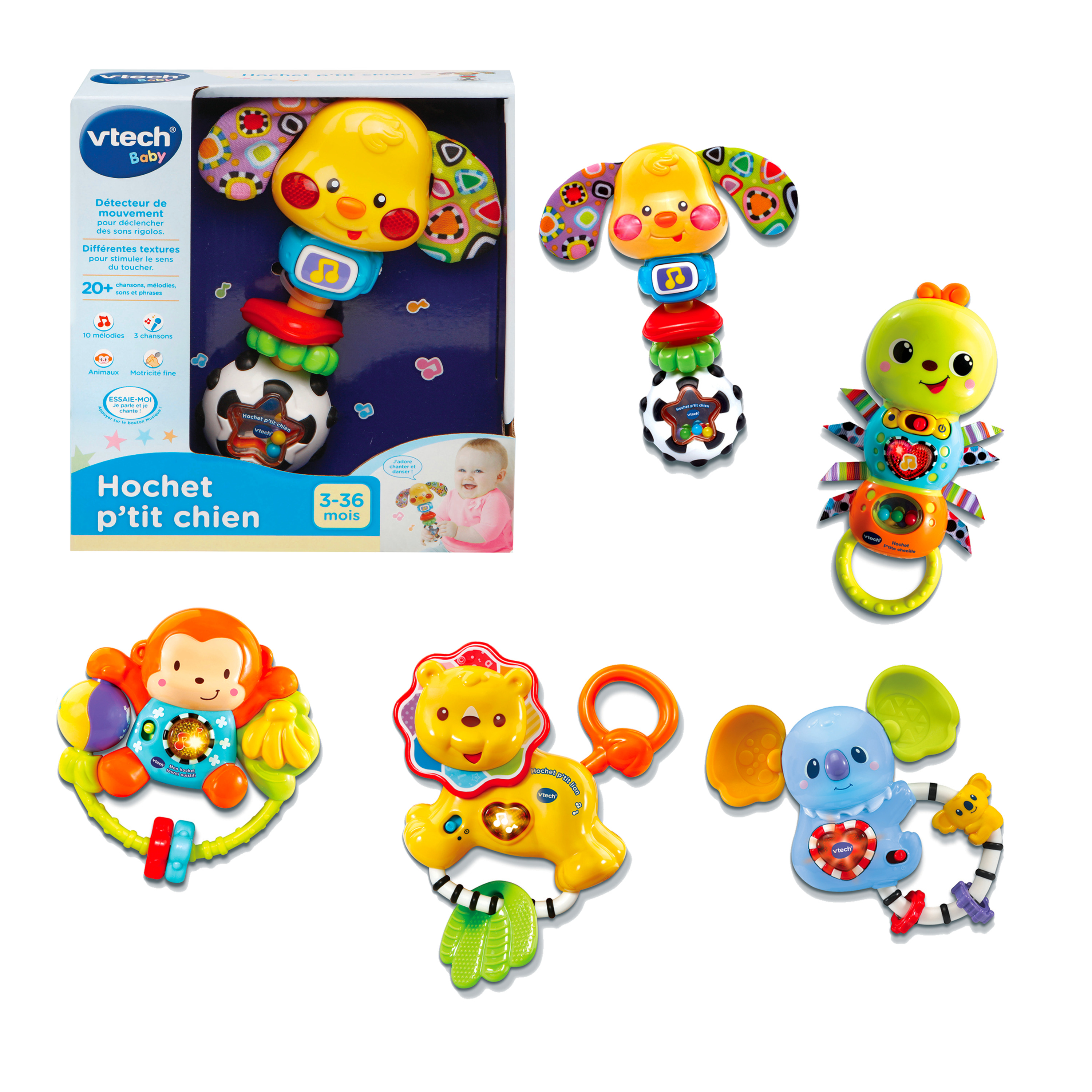 Grâce au détecteur de mouvement, Bébé déclenche des sons et des phrases amusantes lorsqu'il secoue son hochet. Le bouton cœur lumineux permet de déclencher des phrases, des chansons et des mélodies pour amuser Bébé.
