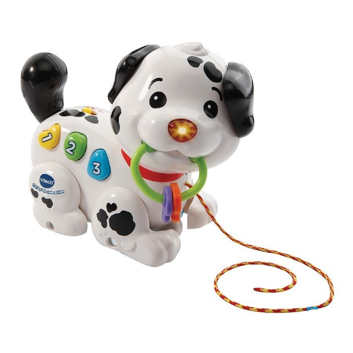 Avec 1.2.3 P’tit dalmatien de VTECH, Bébé promène son chien en tirant la ficelle ses pattes bougent, il déclenche des phrases et des sons amusants. Grâce aux 3 boutons bébé découvre les premiers chiffres, les couleurs et apprend de manière ludique. - Trop mignon, le nez du chien clignote au ry