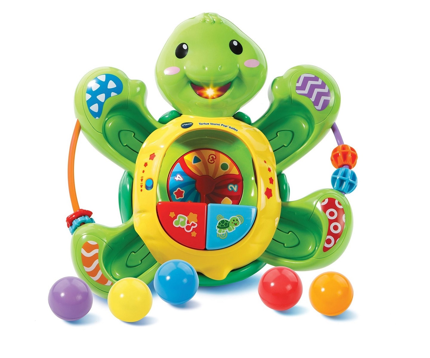 Tortue Tourni Po'balles est une jolie tortue interactive. Elle possède 2 modes de jeu qui sauront amuser bébé. En mode Tourni, la tortue se met à tourner sur elle même dès que l'enfant place les balles dans son ventre. Elle compte les balles puis elle les expulse par ses pattes. En mode Pop, la tort
