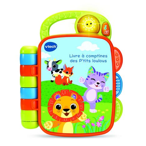 Un premier livre interactif et musical avec poignée intégrée à emporter partout avec soi !4 pages illustrées avec les personnages des P’tits loulous pour découvrir les paroles des 4 comptines du livre : Tous les animaux du monde, Trois p’tits minous, Dans la ferme de Mathurin et Dans la forêt lointaine. Magique ! En tournant les pages du livre, Bébé déclenche automatiquement des sons amusants et des comptines.La couverture du livre s’anime également quand on la fait bouger grâce à son image lenticulaire.1 bouton lumineux permet à Bébé de découvrir les animaux et leur cri et 1 bouton Musique lui permet d’entendre des mélodies.La poignée intégrée et adaptée aux petites-mains permet de transporter facilement le livre.4 comptines et 15 mélodies.Réglage du volume sonore et arrêt automatique.