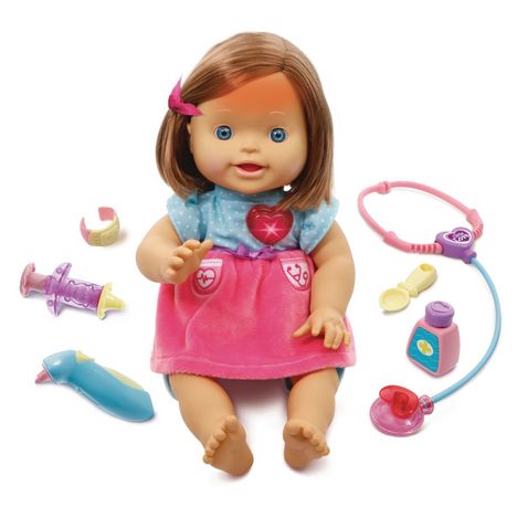Ma poupée à soigner Little Love de Vtech est une poupée interactive et personnalisable (en se rendant sur le site internet dédié). Bébé est malade, vite, il faut le soigner et bien s'en occuper pour l'aider à guérir. Elle se compose de 3 fonctions : un bouton Bilan de santé permet de diagnostiquer le problème, un bouton Conseil de santé et un bouton Soin pour écouter ses besoins journaliers. Des effets lumineux sur son corps permettent de guider l'enfant !Si son front s'illumine, prend lui sa température à l'aide du thermomètre. Si son nez s'illuminer, donne lui ses médicaments. Une piqûre de moustiques ! Fais lui une piqûre et un bandage. Elle ira beaucoup mieux ! Quand on place le stéthoscope sur son cœur, il s'illumine et on entend des battements de cœur réalistes. A toi de jouer à la petite maman !