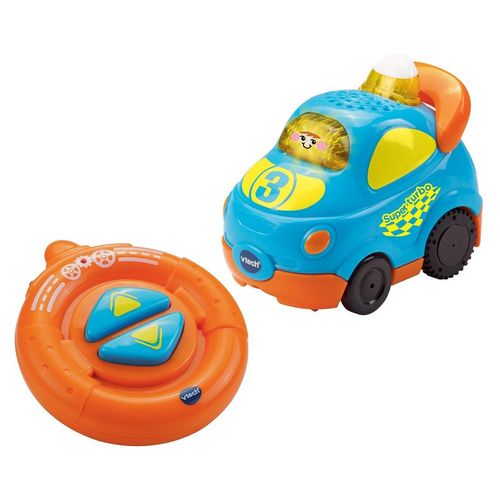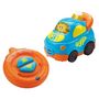 Ma Tut Tut Télécommandée de VTECH est un véhicule avec fonction radiocommandée. Prenez la télécommande pour voir Hugo affronter les autres Tut Tut Bolides radiocommandés dans des courses haletantes ! L’enfant dirige Hugo, super turbo, le fait avancer et reculer. Le bouton lumineux déclenche 3 chansons, 6 mélodies, des phrases et des sons rigolos qui raviront bébé.