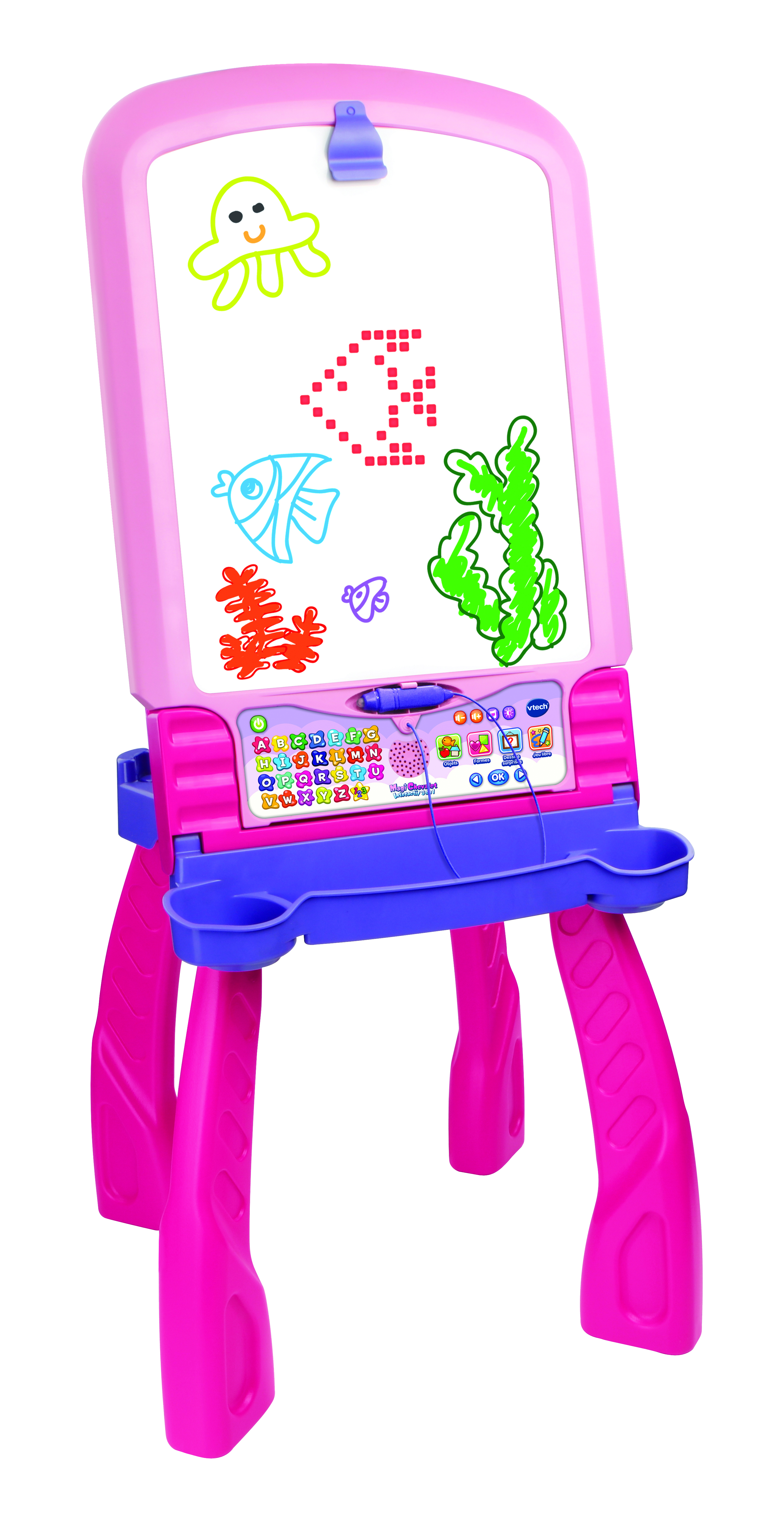 - Chevalet : avec un écran interactif lumineux pour apprendre à tracer les lettres, les chiffres de 1 à 20, 40 objets et 12 formes… L'enfant apprend à tracer les lettres en suivant les lumières qui s'allument une à une à l'écran! Grâce au stylet magique inclus, l'enfant réalise des dessins pas à pas! Génial : une fois terminés, les dessins prennent vie et l'enfant découvre une animation!