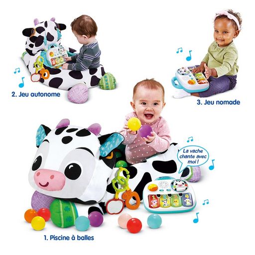 Maxi peluche piscine a balles musicale - 9 - 36 mois Une peluche géante a balles pour faire le plein de découvertes tout en s'amusant ! Cette jolie peluche a câliner en forme de vache se transforme en piscine a balles pour amuser Bébé et éveiller tous ses sens. Tres complete, elle possede : - 2 hochets détachables : 1 anneau de dentition en forme de carotte pour soulager les gencives de Bébé et 1 miroir en forme de pomme pour que Bébé découvre son reflet. - 1 piano interactif avec 4 touches lumineuses, une balle rotative et un personnage a manipuler. 3 modes de jeu permettent aux tout-petits de découvrir les couleurs, les animaux, les chiffres et de jouer de la musique. - 30 balles souples et colorées sont également incluses. Un rangement est situé au niveau du cou de la peluche. Un panneau en tissu permet de les libérer dans la piscine a balles. Différentes matieres et textures pour éveiller les sens se Bébé. 5 chansons et 12 mélodies rythment le jeu. Arret automatique. Boîte Try-me. Fonctionne avec 2 piles LR6 fournies.