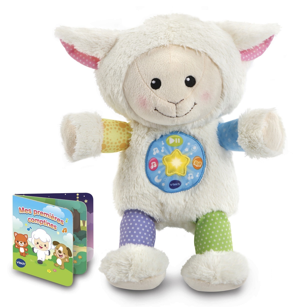 Mon mouton comptines câlines de Vtech est un mouton parlant et musical interactif ! Cette peluche veilleuse toute douce accompagne Bébé au moment du coucher et apaise ses nuits. Il contient une étoile avec des variations lumineuses qui rassure Bébé, 50 mélodies et 4 chansons qui pourront être jouées jusqu'à 30 minutes en continu, 4 chansons et 4 comptines parlées que Bébé peut suivre avec ses parents grâce au petit livre de 4 pages inclus.