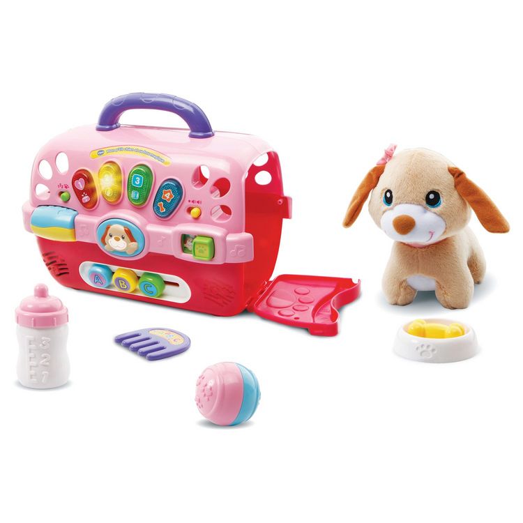 Ce p'tit chien en peluche trop mignon ne demande qu'à jouer avec toi ! Emmène-le partout grâce à son panier de transport parlant et interactif : des sons rigolos s'activent quand tu ouvres ou fermes la porte. Les 4 boutons lumineux sur la box permettent de découvrir les premiers chiffres, les couleu