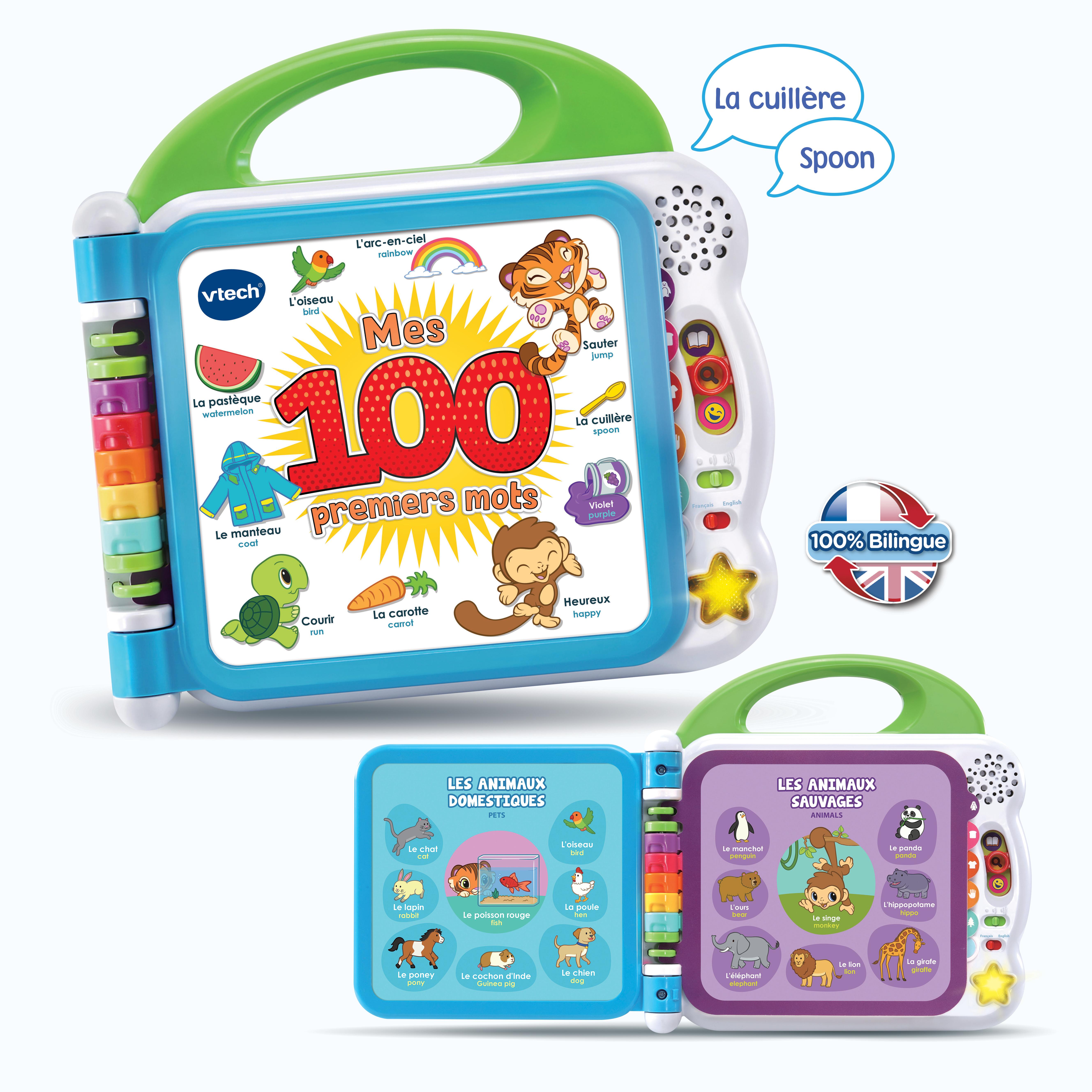 | Avantages | Cet imagier parlant et interactif permet de découvrir 100 mots de vocabulaire en français et en anglais avec les personnages | |