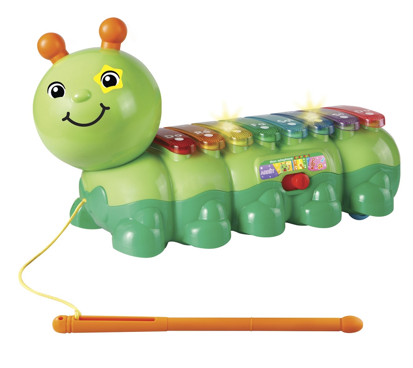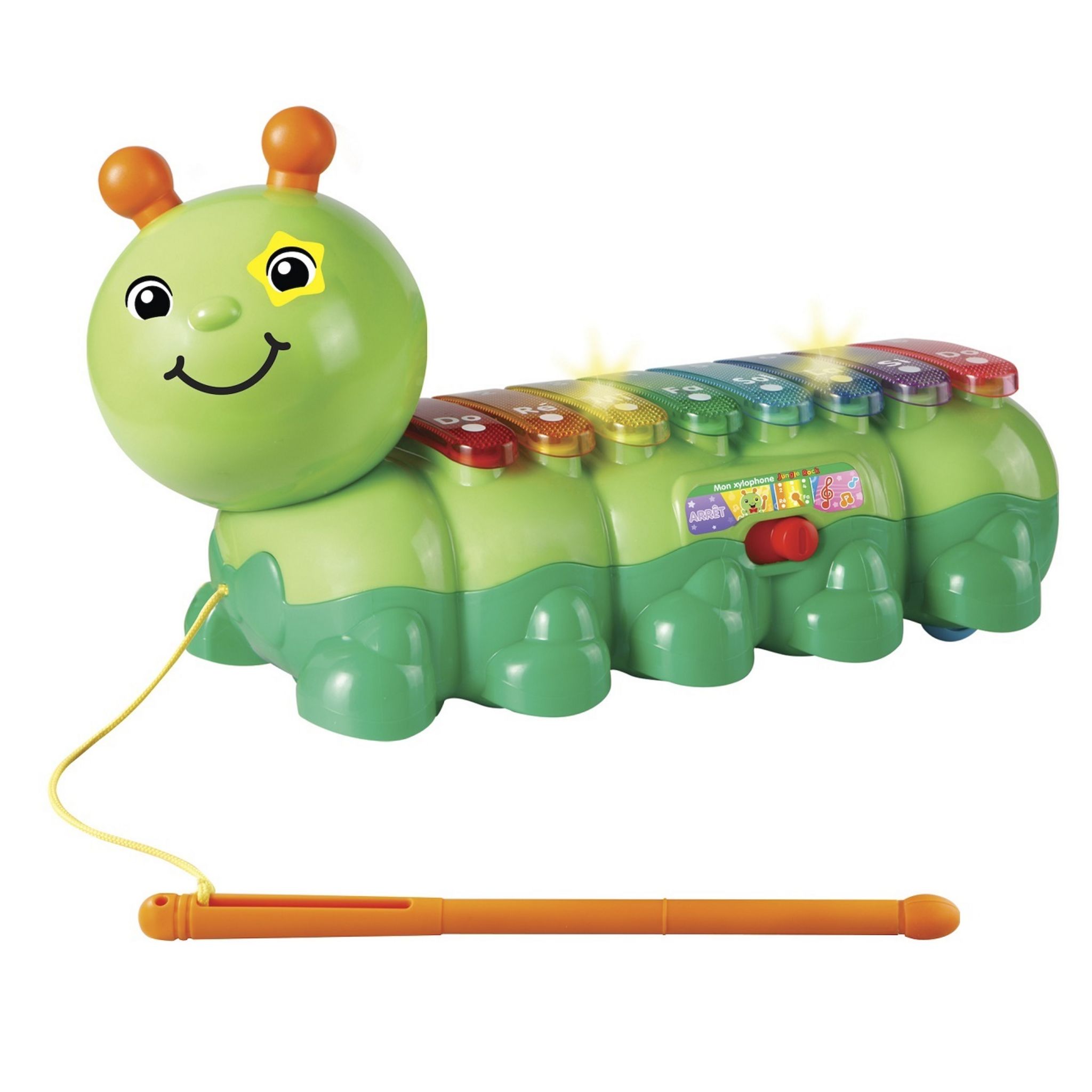 Mon xylophone jungle rock de Vtech est une jolie petite chenille à promener partout. En plus, elle permet à l'enfant de s'initier à la musique.Il lui suffit de taper sur les 8 touches musicales lumineuses à l'aide du maillet fourni. Il découvrira alors les notes de musique. 3 modes de jeu sont disponibles pour que l'enfant apprenne à jouer : jeu libre, mémorisation ( en appuyant sur les touches qui s'illumine une à une) et apprentissage d'une mélodie.