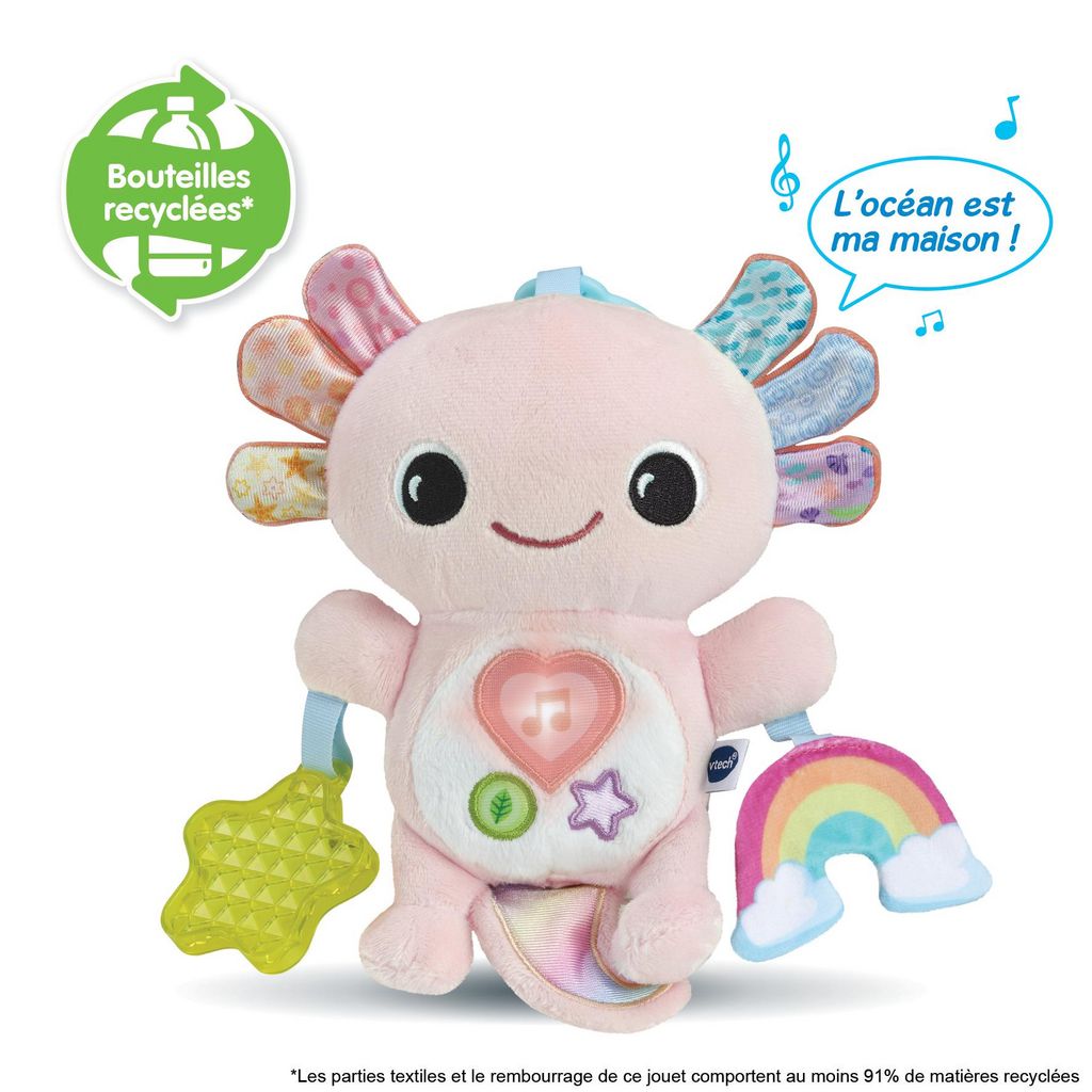 Eliott, Bébé Axolotl musical (bouteilles plastique recyclées) - 3 - 36 mois. Un bébé axolotl musical à emporter partout avec soi !. Très mignonne, cette peluche aux couleurs toutes douces possède 3 boutons interactifs sur son ventre :. Un bouton Coeur lumineux pour déclencher des chansons, des mélodies et des phrases amusantes. Un bouton Sons de la nature. Un bouton Etoile pour déclencher 3 chansons et 15 mélodies connues des tout-petits. Un hochet transparent texturé pour stimuler la vue des tout-petits. Un hochet arc-en-ciel en papier bruissant stimule quant à lui le toucher de Bébé. Pratique ! Un anneau d'accroche permet de l'attacher facilement à une poussette ou à un cosy. Différentes matières et textures : branchies et queue en tissu brillant, hochet en peluche. Le module électronique est détachable pour que la peluche puisse être lavée facilement à la main. La partie textile et son rembourrage comporte au moins 91% de matières recyclées. Arrêt automatique. Boîte Try-me. Fonctionne avec 2 piles LR03 fournie.