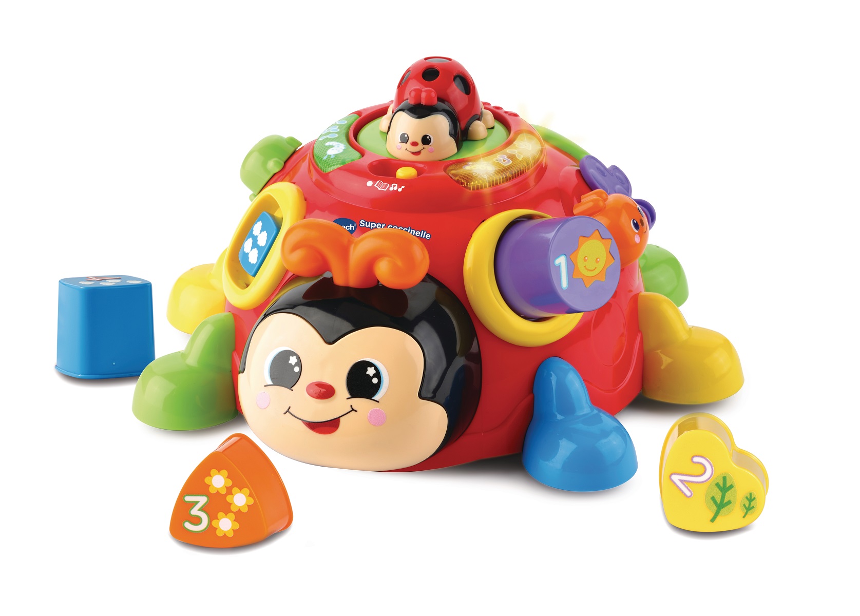 Super coccinelle des formes est une coccinelle musicale et parlante afin que bébé puisse découvrir les formes tout en s'amusant ! Il y a 4 formes colorées à encastrer qui permettront à votre enfant de découvrir les formes, les chiffres, les couleurs ainsi que le vocabulaire de la nature. Les boutons lumineux et interactifs seront le meilleur moyen afin d'éveiller les sens de votre enfant. Le bébé coccinelle sur le dos de la maman permet d’éjecter toutes les formes lorsqu'on appuie sur sa tête, ce qui permet de recommencer le jeu à l'infini. Votre enfant pourra également promener sa coccinelle dans toute la maison grâce au cordon de traction et aux pieds maniables.