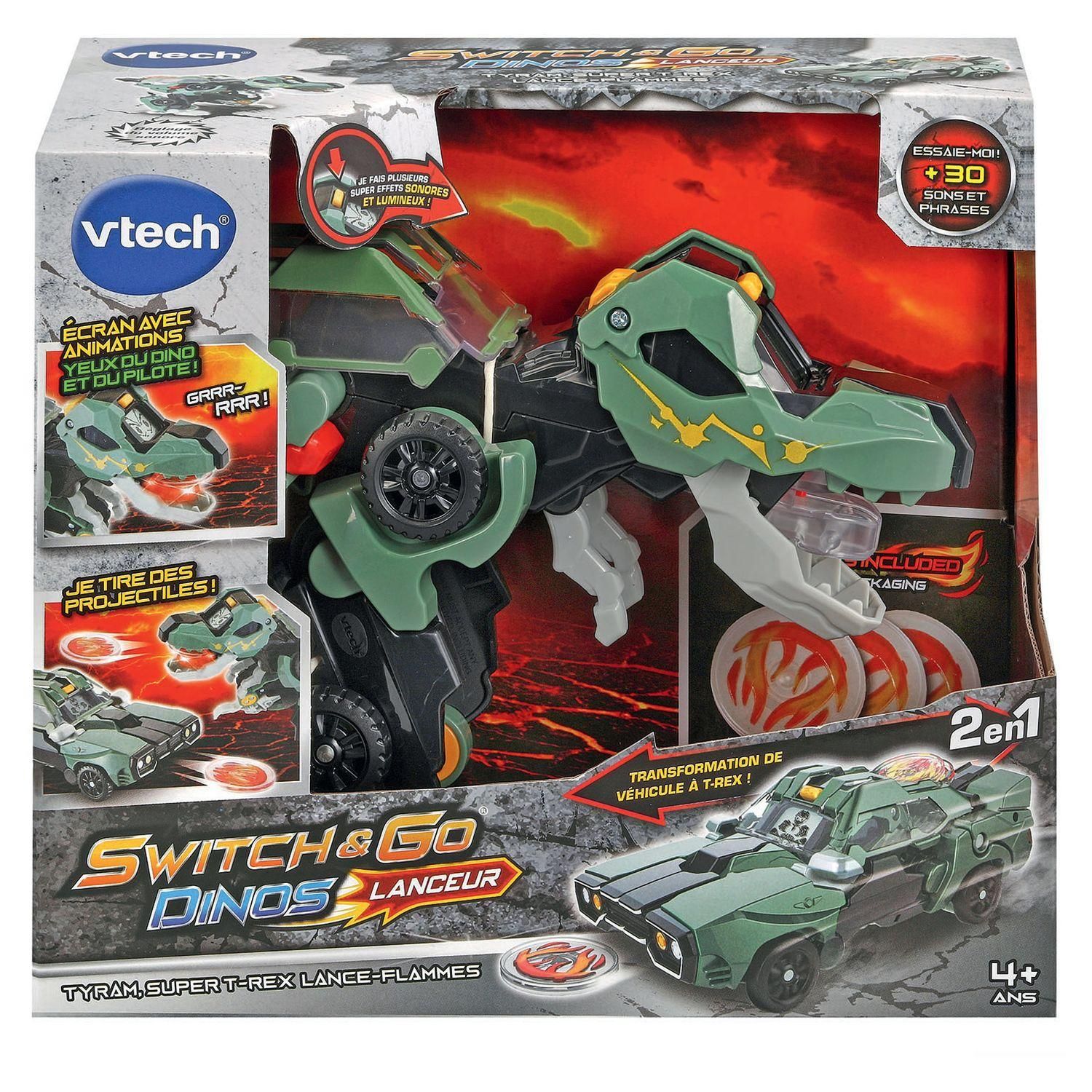 Switch et Go Dinos Lanceur - Tyram, Super T-Rex lance flammes - 4 ans et +. Tyram, super T-Rex lance-flammes se transforme en quelques manipulations en véhicule. Deux modes de jeu : mode Véhicule et mode Dino. Chaque mode se déclenche automatiquement lorsque la transformation est effectuée. Écran LCD avec animations : pilote pour le mode Véhicule et yeux de dino pour le mode Dinosaure. Grâce au lanceur intégré sur sa carrosserie, Tyram peut lancer les 3 projectiles inclus. Ils peuvent ensuite être directement rangés sur la carrosserie. Le bouton Lancement permet de tirer les projectiles placés dans la bouche du dinosaure. Le Bouton Action en mode Dino permet de faire bouger les pattes et d'ouvrir la mâchoire du dino. La LED rouge dans sa bouche s'éclaire quand il ouvre la mâchoire pour cracher du feu. Avec plus de 50 sons réalistes et phrases liés à l'univers des dinos et des effets lumineux. Arrêt automatique. Boîte try-me. Fonctionne avec 2 piles LR03 fournies.