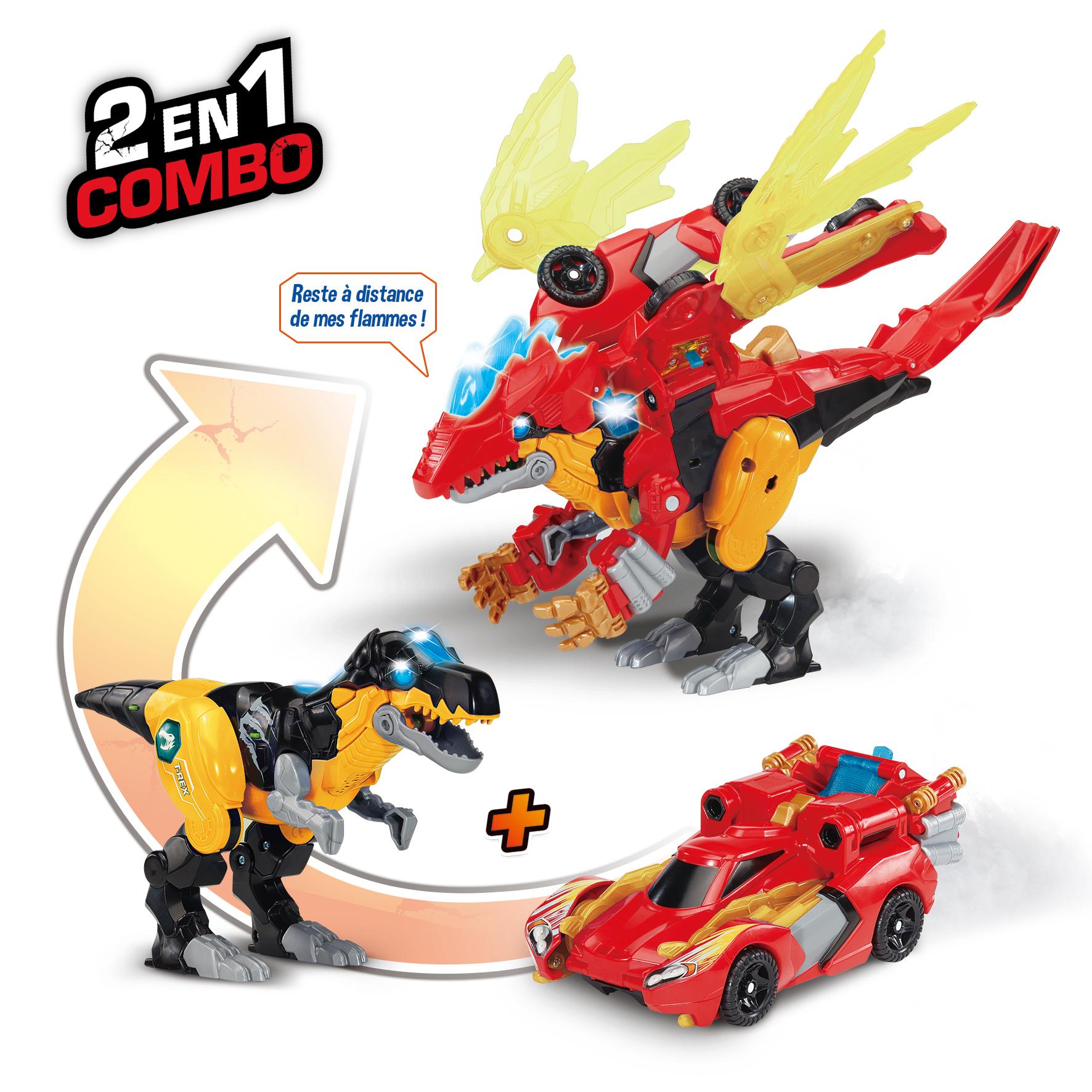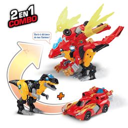 Switch et Go Combo - Dragorex, le méga dragon 2 en 1 - 4 ans +. Un super T-rex et une voiture de course à assembler facilement pour créer un dragon encore plus impressionnant !. Deux modes de jeu : mode T-Rex et mode Dragon. Chaque mode se déclenche automatiquement lorsque la transformation est effectuée. Boutons pour déclencher les phrases et les effets sonores et bouton 'Action' en mode Dragon pour faire bouger les ailes et ouvrir la mâchoire du dragon et déclencher des effets sonores et lumineux. Avec des sons réalistes, des phrases liées à l'univers des dinos et des effets lumineux. Plus de 60 phrases et effets sonores réalistes. Arrêt automatique et réglage du volume sonore. Boite Try-me. Fonctionne avec 1 pile LR6 fournie.
