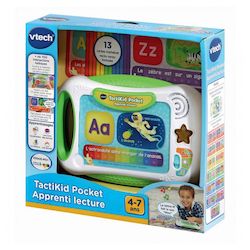 TactiKid Pocket Apprenti'lecture - 4 - 7 ans. Une tablette éducative 100% prête à jouer, sans écran et tacile pour apprendre à lire du bout des doigts !. 14 fiches incluses (1 permanente et 13 recto-verso) pour apprendre l'alphabet et découvrir des mots et des phrases associés. Magique ! En insérant les fiches d'activités dans la tablette, elles sont automatiquement reconnues. Il n'y a plus qu'à les découvrir en touchant les illustrations de la fiche. Pour encore plus de fun, en glissant le doigt sur la flèche colorée, l'enfant peut entendre chaque mot prononcé ou la phrase entière et ainsi s'initier à la lecture. Trop rigolo ! En glissant le doigt plus rapidement, la voix se transforme et parle plus vite. La touche étoile lumineuse s'illumine en rythme avec les sons. 3 modes de jeu :. - Musique : pour écouter 5 mélodies et déclencher des sons amusants. - Apprentissages : pour découvrir les lettres, la phonétique, les objets et les couleurs. - Quiz : pour tester ses connaissances en répondant correctement aux questions posées par la tablette. Sans téléchargement ni contenu additionnel à prévoir. Zone de rangement située à l'arrière de la tablette pour y placer les fiches d'activités. Réglage du volume sonore et arrêt automatique. Boîte Try-me. Fonctionne avec 3 piles LR03 fournies.