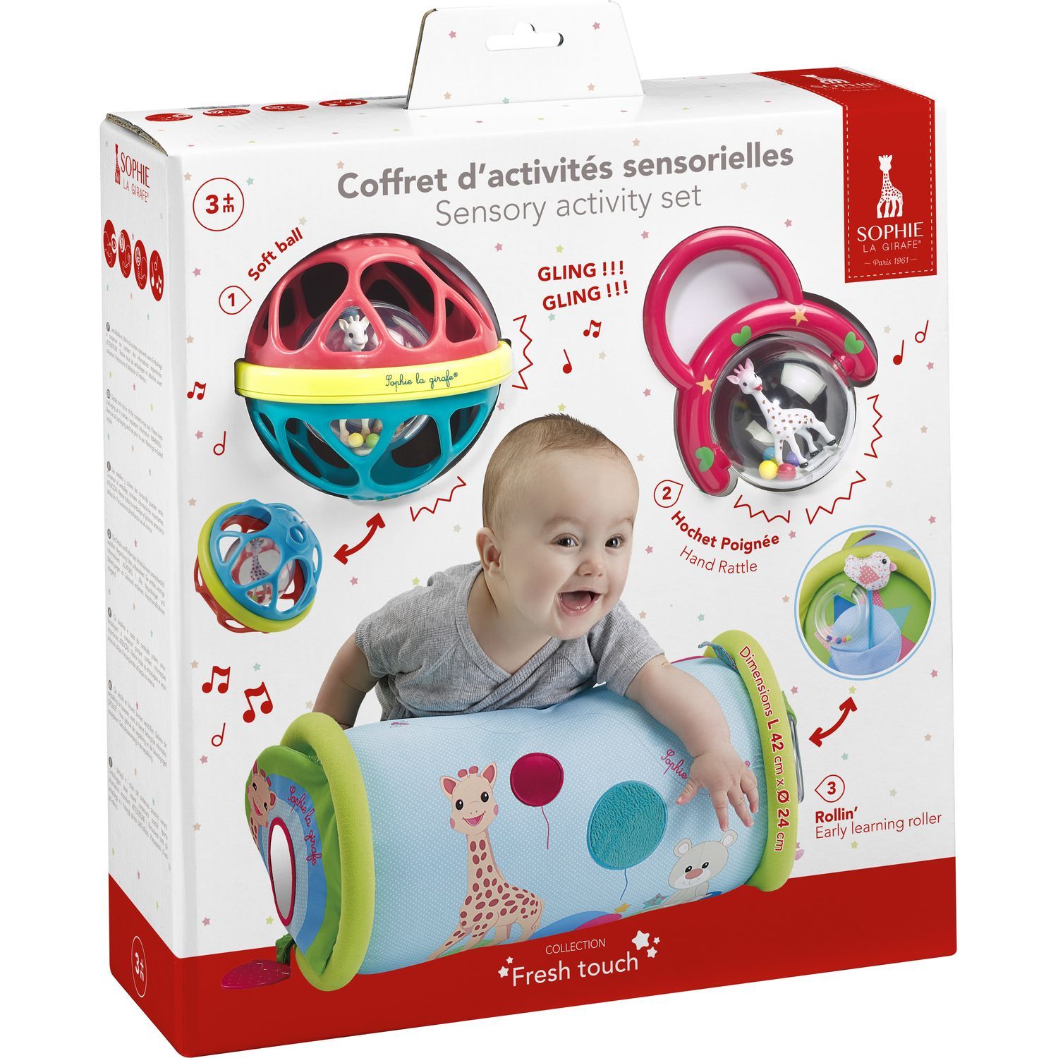 Ce coffret est parfait comme cadeau de naissance ! Il comprend : un rollin Sophie la girafe, un hochet pogné Sophie et une soft ball Sophie la girafe.