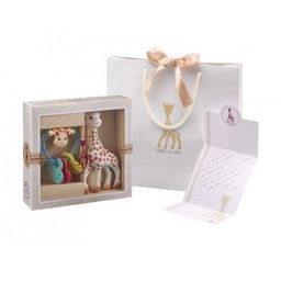 Découvrez ce joli coffret de naissance Sophie la Girafe ! La célèbre girafe deviendra le doudou préféré de bébé, tout en l'aidant à faire ses dents ! 100 % en caoutchouc naturel, elle ne présente aucun danger pour la santé de votre petit bout. Le coffret comporte également un hochet souple à mordiller, orné de trois petits cœurs et garni de billes. Pour offrir ce tendre cadeau, vous trouverez dans ce coffret une carte personnalisée et un joli sac cadeau !