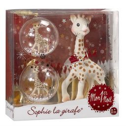 En savoir +Coffret de noël Sophie la girafe avec deux boules de Noël.