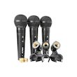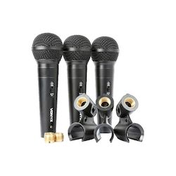 Découvrez l'ensemble de microphones dynamiques Vonyx VX1800S, conçu pour le karaoké et les discours. Ce kit comprend trois microphones cardioïdes unidirectionnels au design noir altique avec finition métallique. Chaque microphone possède un interrupteur On/Off et un filtre anti-pop intégré pour une