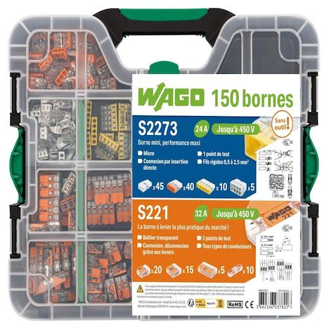 Composition de l'assortiment : S2273 2 fils X 45 3 fils X 40 5 fils X 10 8 fils X 5 S221 2 fils X 20 3 fils X 15 5 fils X 5 2 fils en ligne X 10Nombre d'entrées : 2Type de câble : Rigide et soupleSection du câble (en mm²) : S2273 Rigide 0 5 à 2 5 mm² S221 Rigide 0 2 à 4 0 mm² S221 Souple 0 1