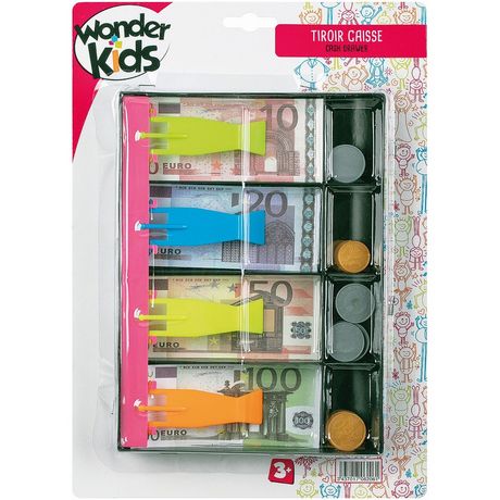 Tiroir caisse monnaie - Idéal pour apprendre a compter et a ranger - Ce tiroir caisse comporte 4 types de billets (10, 20, 50 et 100?) et 4 types de pieces (1, 2, 10, 15 centimes) - Garçon et Fille - a partir de 3 ans - Livré a l'unité