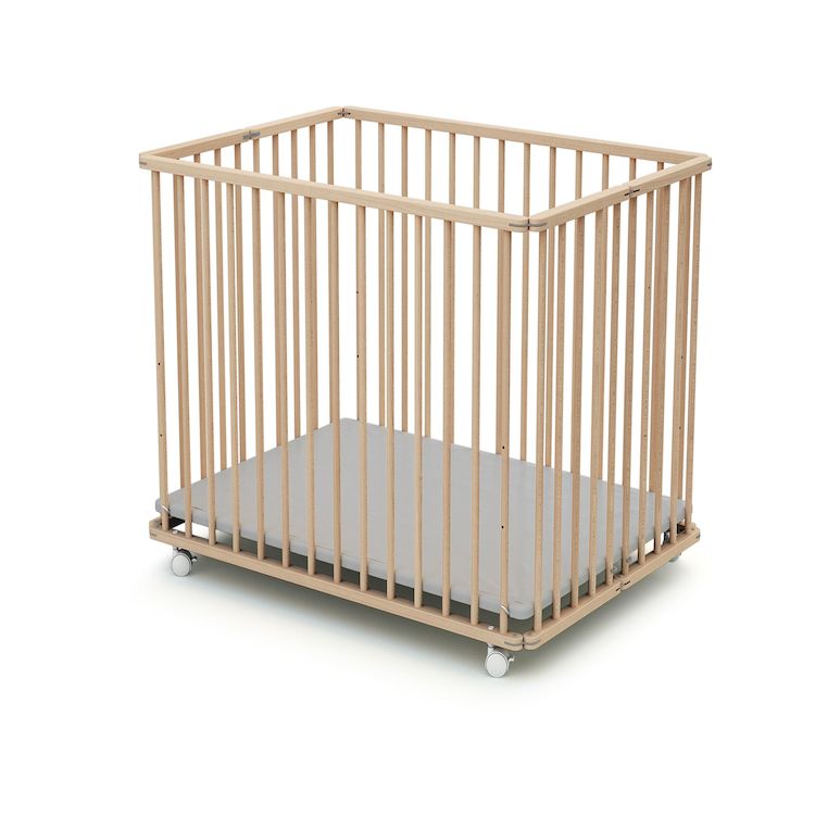 Fabriqué en bois de hêtre massif, il est équipé de 4 roues avec frein et d'un fond en PVC gris réglable 3 hauteurs.