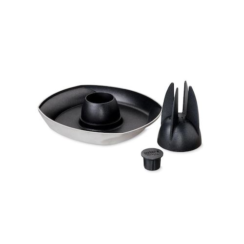 Préparez un poulet sur canette de bière d'exception. Ou servez des nachos avec de la sauce dans la partie centrale directement depuis le barbecue. Le très polyvalent support de cuisson pour poulet Deluxe peut accueillir un poulet mis à la verticale sur un récipient intégré, idéal pour imprégner la viande de sucs, de vin, de bière et d'épices. Quand le liquide dans le récipient chauffe, la vapeur parfume la viande de délicieuses saveurs, et la base récupère les jus pour badigeonner la viande ou préparer une soupe ou une sauce. Le bouchon fournit permet de conserver la vapeur à l'intérieur. Vous pouvez également remplir la base de pommes de terre ou de légumes, qui s'imprégneront du jus de la viande pendant la cuisson. Aussi robuste qu'élégant et pratique, le support de cuisson pour poulet Deluxe, à revêtement céramique, est antiadhésif et passe au lave-vaisselle, si bien que vous pourrez vous consacrer à vos invités après le repas au lieu de la vaisselle.