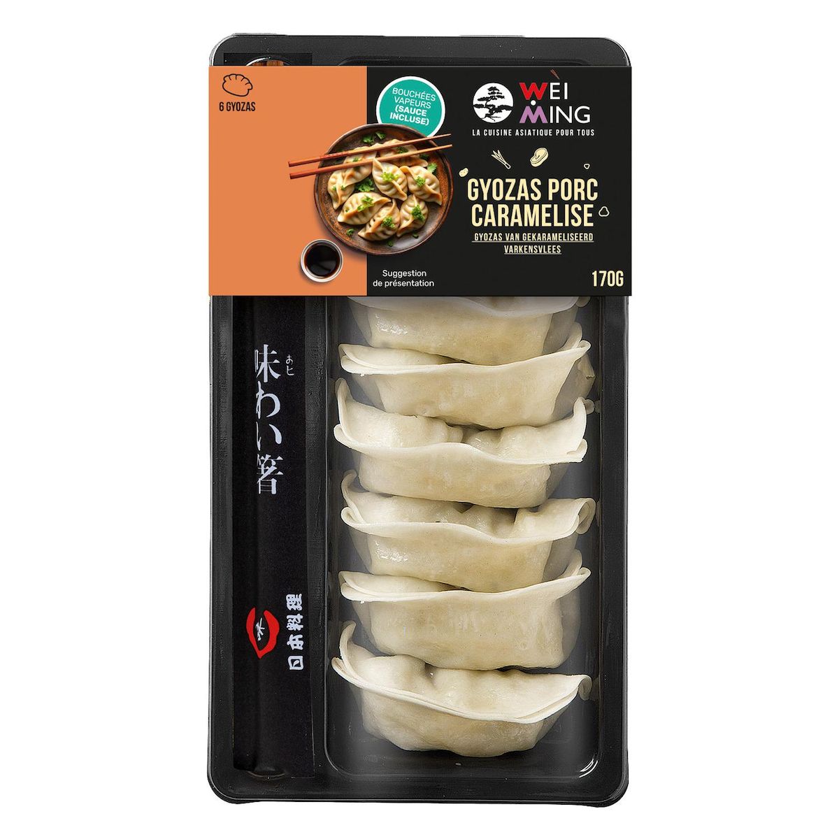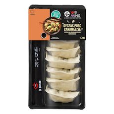 Ingrédients : GYOZAS (154g) : Farce (58 %) : oignon, viande de porc (longe) (19 %), sucre, protéine de SOJA, huile végétale (navette), ail, fécule de pomme de terre, acidifiants (lactate de potassium et diacétate de sodium), sauce SOJA (eau, colorant (caramel simple et caramel au sulfite d’ammonium), sucre, sel, SOJA, BLE), sel, épices (anis étoilé, graines de fenouil, poivre et cannelle), écorce de mandarine et poivre noir. Pâte : farine de BLE, eau, gluten de BLE et sel.